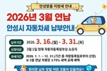 경기뉴스광장 정일수 기자 |안성시가 3월 연납븐 자동차세 신고·납부의 갈을 운영한다고 16일 밝혔다. 특히, 3월 연납 신청시 3.75% 세액공제 혜택을 받는다고 밝혔다. 자동차세 연납 제도는 매년 6월과 12월에 나눠 내는 자동차세를 미리 납부할 경우 세액의 일부를 공제해 주는 제도다. 이번 3월에 신청·납부하면 연세액의 3.75%를 공제받을 수 있다. 신청 대상은 자동차, 이륜차, 기계장비 등 자동차세 부과 대상이 되는 모든 차종이다. 지난 1월에 신청하지 못했거나 3월 중 차량을 새로 구매한 소유자는 3월31일까지 안성시청 세정과 또는 가까운 읍·면 행정복지센터를 방문하거나 전화로 신청할 수 있다. 또한, 16일부터는 온라인 ‘위택스’ 홈페이지와 스마트폰 ‘스마트 위택스’ 앱을 통해서도 간편하게 신청이 가능하다. 연납시 주의할 점은 기존의 자동이체 서비스가 적용되지 않아 고지서를 확인해 직접 납부해야 한다는 점이다.