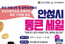 경기뉴스광장 정일수 기자 |안성시가 오는 20일부터 29일까지 관내 전통시장과 골목형상권 일원에서 ‘경기살리기 통큰세일’을 진행한다고 18일 밝혔다. 이번 행사는 고물가와 소비 위축으로 어려움을 겪는 전통시장 및 골목상권에 활력을 불어넣기 위해 마련됐으며, 경기도와 경기도시장상권진흥원이 주관하고 안성시가 함께 추진한다. 행사에는 안성시 내 전통시장과 골목형상권 등 총 9개소에 소속된 점포들이 참여한다. 행사 기간 중 참여 업소에서 안성사랑카드로 결제하면 결제 금액의 최대 30%(통큰세일 20%, 안성시 추가 10%)를 돌려주는 캐시백 행사도 병행한다. 최대한 많은 시민이 혜택을 받을 수 있도록 ‘통큰세일’ 관련 환급 한도는 1인당 1일 최대 3만원, 행사 기간 총 12만원으로 제한된다. 여기에 안성시 추가 혜택 최대 5만원을 더하면 인당 총 17만원까지 캐시백을 받을 수 있다. 자동 지급된 환급액은 오는 5월31일까지 사용해야 한다. 행사 참여 상권과 세부 혜택은 경기도시장상권진흥원 홈페이지에서 확인할 수 있다.