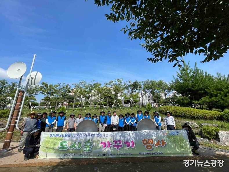 경기뉴스광장 최옥분 기자 |삼성전자 임직원 등 17명이 지난 27일 평택시 통복천 참여의숲에서 ‘도시숲 가꾸기 행사’를 진행했다.