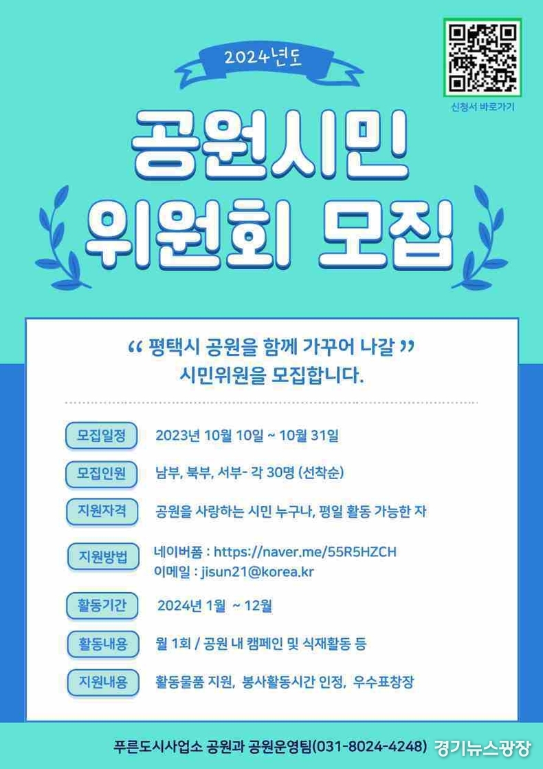 경기뉴스광장 최옥분 기자 |평택시 푸른도시사업소 공원과는 시민의 자발적 참여를 통해 공원을 함께 가꾸어갈 2024년 평택시 공원시민위원회를 오는 10일부터 31일까지 모집한다고 4일 밝혔다.