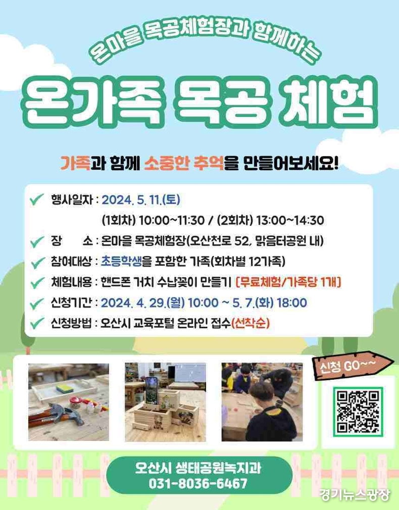 경기뉴스광장 최옥분 기자 |오산시가 가정의 달을 맞아 다음달 11일 맑음터공원 내 온마을 목공체험장(오산천로 52)에서 오산시에 거주하는 초등학생을 포함한 가족을 대상으로 ‘온가족 목공 체험 행사’를 진행할 예정이라고 29일 밝혔다.