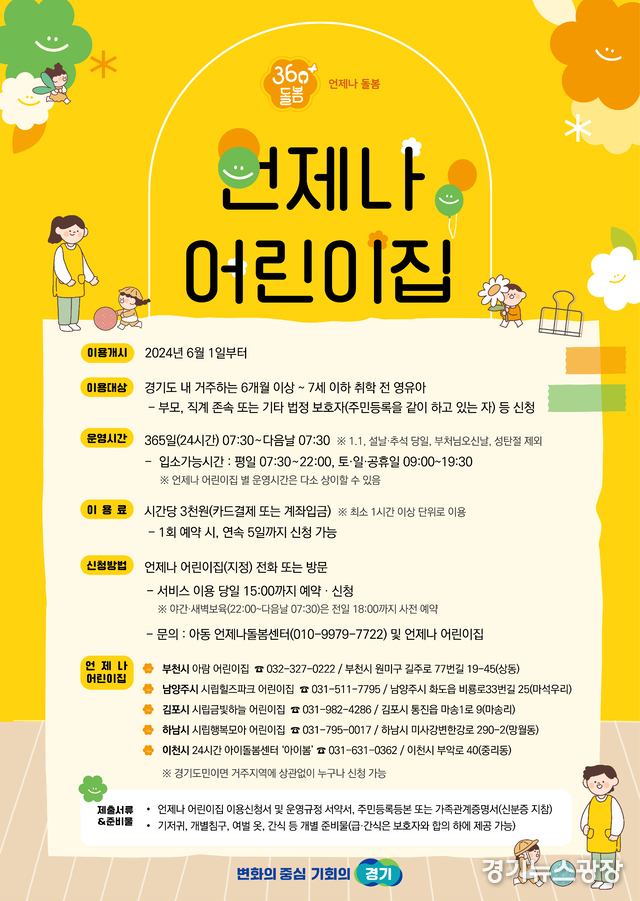 경기뉴스광장 최옥분 기자 |경기도가 생후 6개월부터 7세까지 취학 전 영유아를 둔 부모(보호자)라면 일시적·긴급상황 발생시 365일 24시간 언제든지 안심하고 자녀를 맡길 수 있는 360°돌봄 ‘언제나 어린이집’을 오는 6월1일부터 부천 등 5곳에서 운영한다.