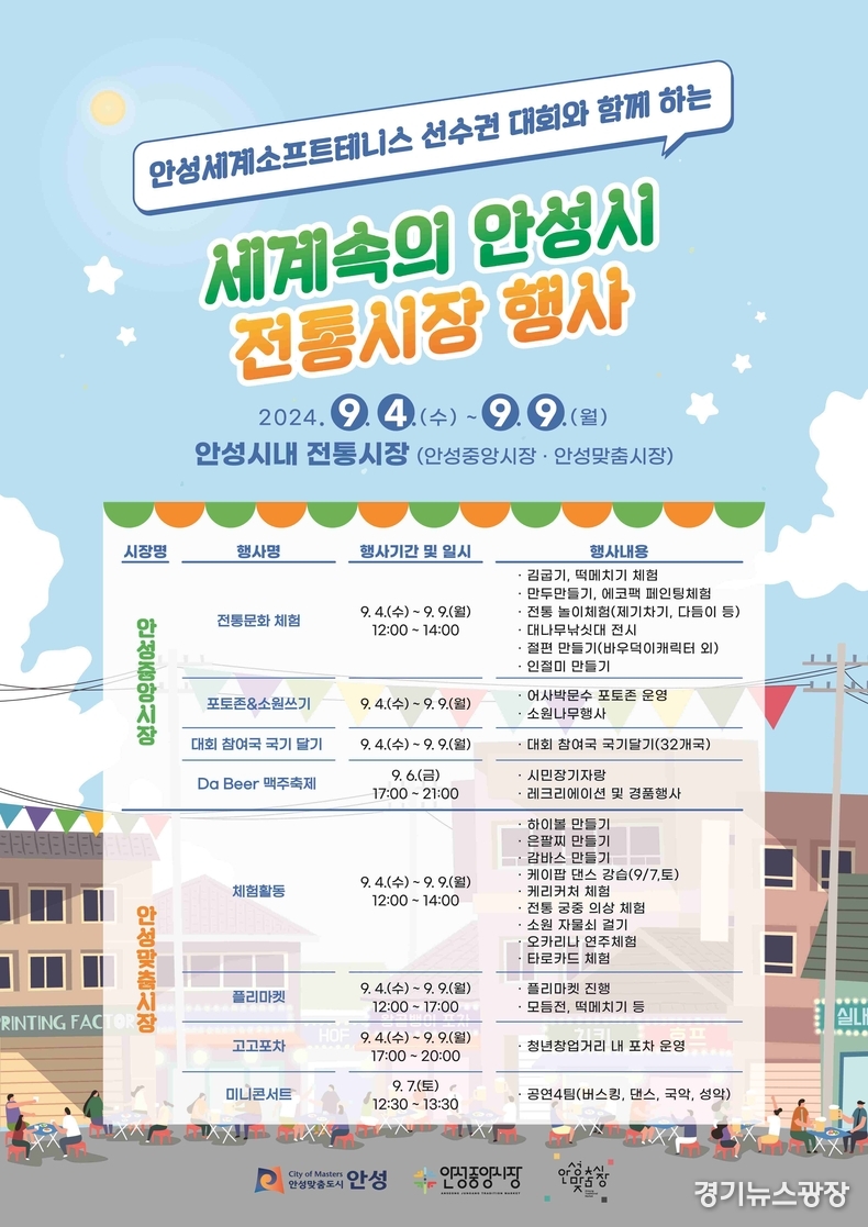 경기뉴스광장 최옥분 기자 |안성의 전통시장인 안성중앙시장, 안성맞춤시장에서 상인회 주관으로 안성시 세계소프트테니스 선수권 대회에 맞춰 다양한 행사가 진행된다.