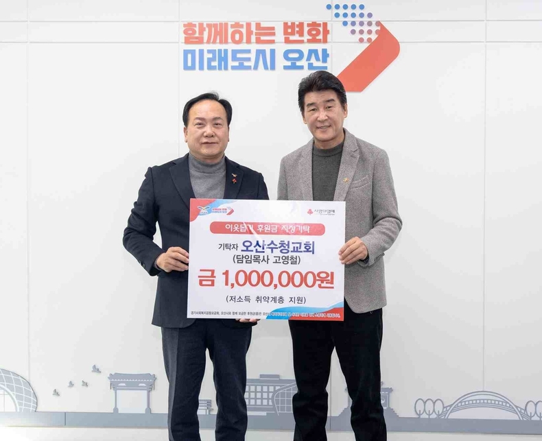경기뉴스광장 정일수 기자 |오산시가 지난 26일 오산수청교회(담임목사 고영철)가 희망2026나눔캠페인에 동참해 관내 취약계층 지원을 위한 성금 100만원을 기탁했다.