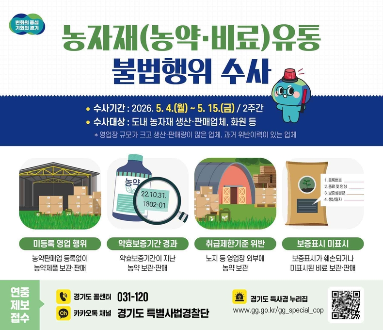 경기뉴스광장 강성규 기자 |경기도 특별사법경찰단은 5월4일부터 15일까지 도내 농약 생산·판매업체, 농자재점, 화원 등 300곳을 대상으로 불법 유통행위를 집중수사 한다.