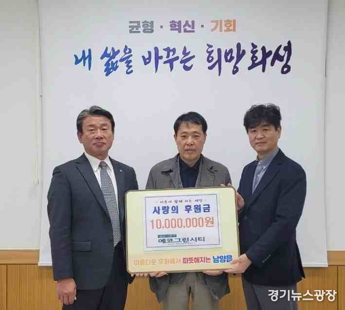 경기뉴스광장 최옥분 기자 |화성시청역 에코그린시티가 19일 화성시 남양읍행정복지센터에 따뜻하고 더불어 사는 아름다운 실천을 위한 후원금 1000만원을 전달했다.