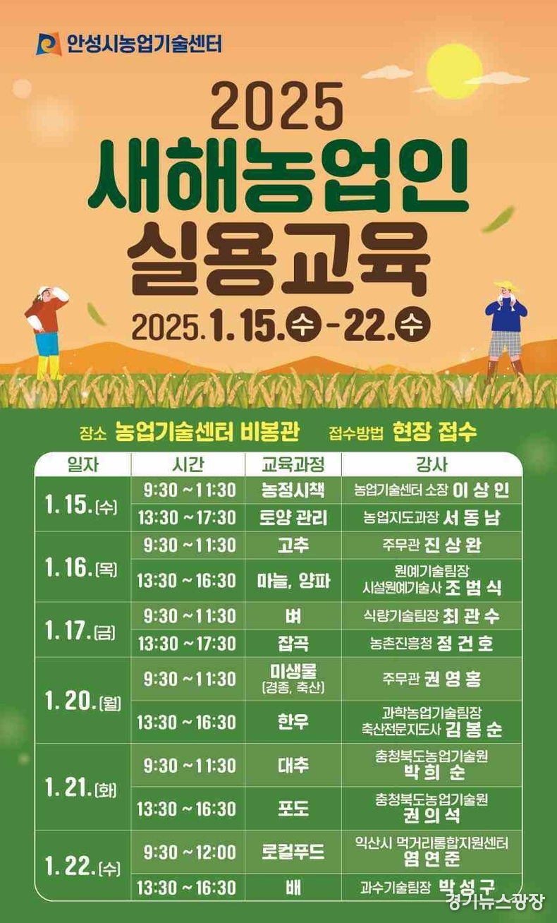 경기뉴스광장 최옥분 기자 |안성시농업기술센터(소장 이상인)는 오는 15일부터 22일까지 2025년 새해농업인 실용교육을 실시한다고 6일 밝혔다.