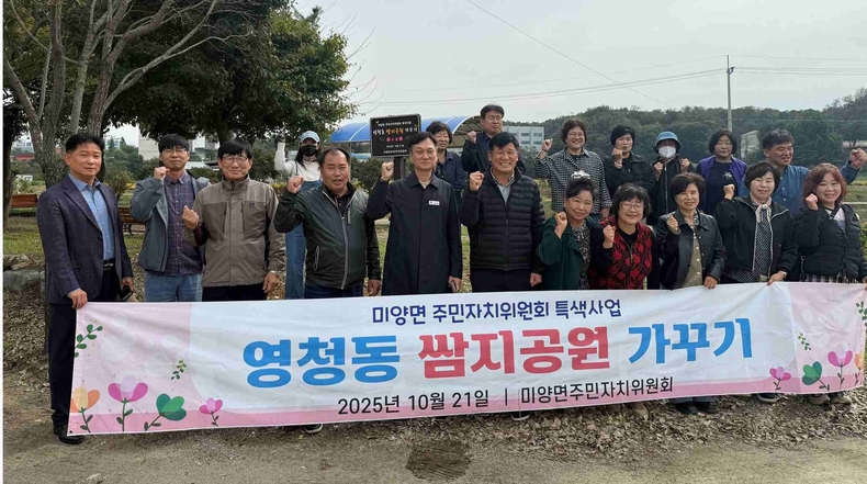 ‘영청동 쌈지공원 가꾸기’는 미양면 주민자치위원회가 마을 내 유휴공간을 정비하고 꽃과 나무를 식재하여 쾌적한 녹색쉼터를 조성한 사업이다. 이번 현판식에는 위원들이 공원 곳곳을 점검하고 주변 환경을 정돈하는 등 공원 가꾸기 활동을 이어가며 의미를 더했다.