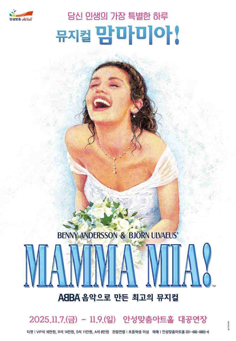 유쾌한 웃음과 아바(ABBA)의 명곡이 어우러진 뮤지컬‘맘마미아’의 티켓가는 VIP석 16만원, R석 14만원, S석 11만원, A석 8만원이며 안성 시민은 20%할인 혜택을 받을 수 있다.
