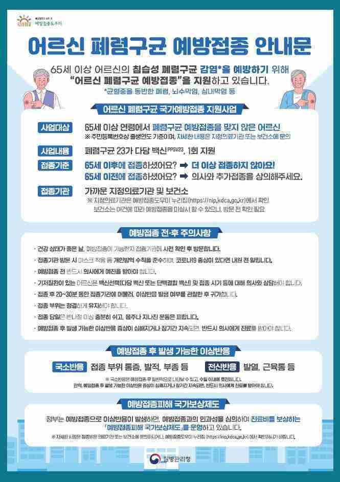 어르신 폐렴구균 예방접종은 2013년 보건소 접종을 시작으로 매년 지원하고 있으며, 65세 이상 어르신(1960년 12월31일 이전 출생자, 2025년도 기준) 중 미접종자는 가까운 위탁의료기관을 통해 무료 접종(1회)이 가능하다.