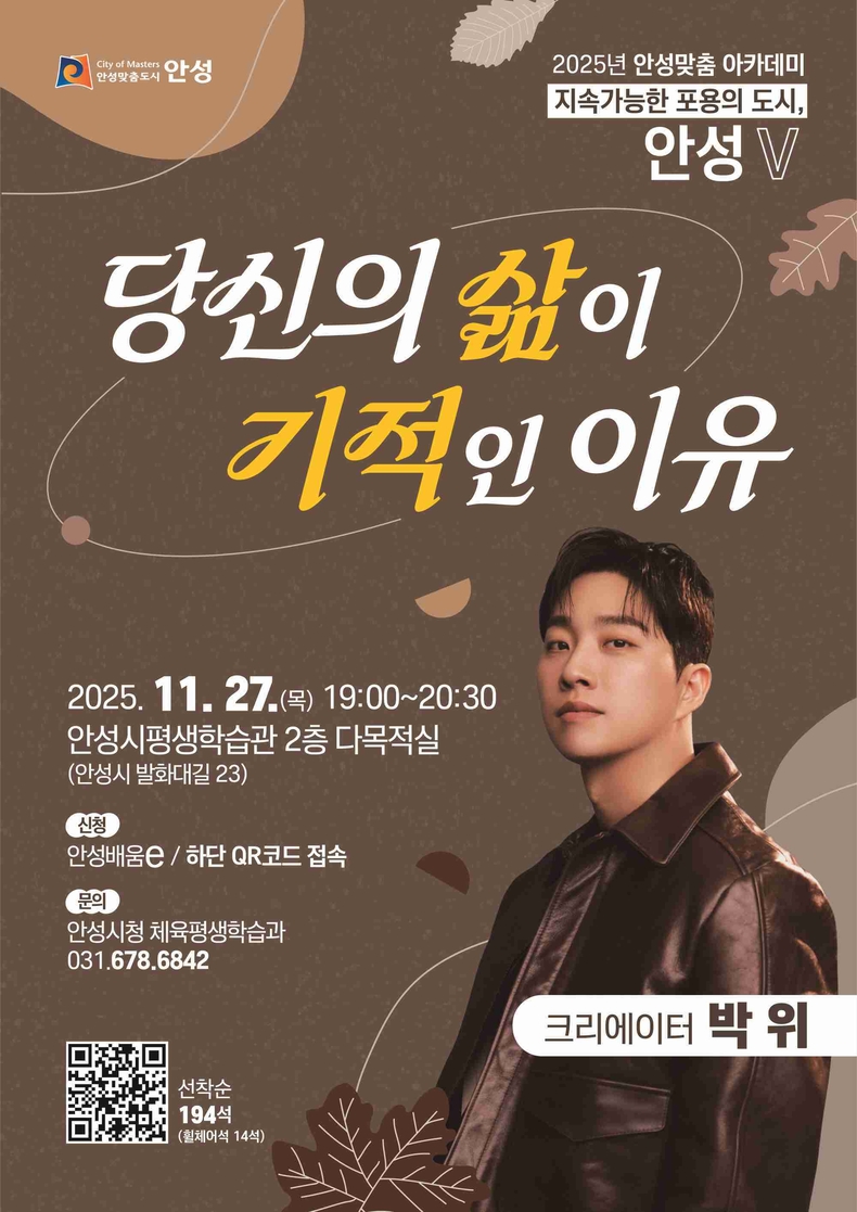 이번 강연은 안성배움e 플랫폼을 통한 온라인 선착순으로 접수로 진행되며, 총 194명까지 신청이 가능하다. 특히 휠체어 이용 시민을 위한 전용석 14석을 지정·운영해 누구나 함께 참여할 수 있는 포용적 강연 환경으로 운영할 예정이다.