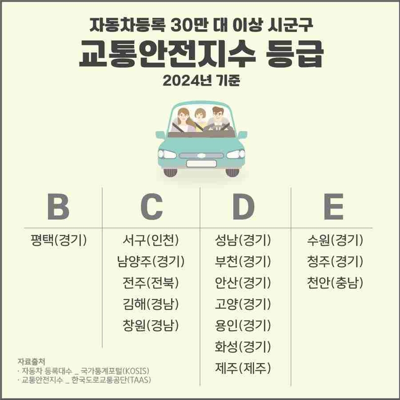 평택시 교통안전지수 등급은 30만 대 이상 자동차가 등록된 전국 시군구 중 가장 높은 것으로 나타났다. 자동차등록 30만대 이상 시군구는 총 16개로, 평택시를 제외한 15개 시군구는 C~E등급에 머물렀다.