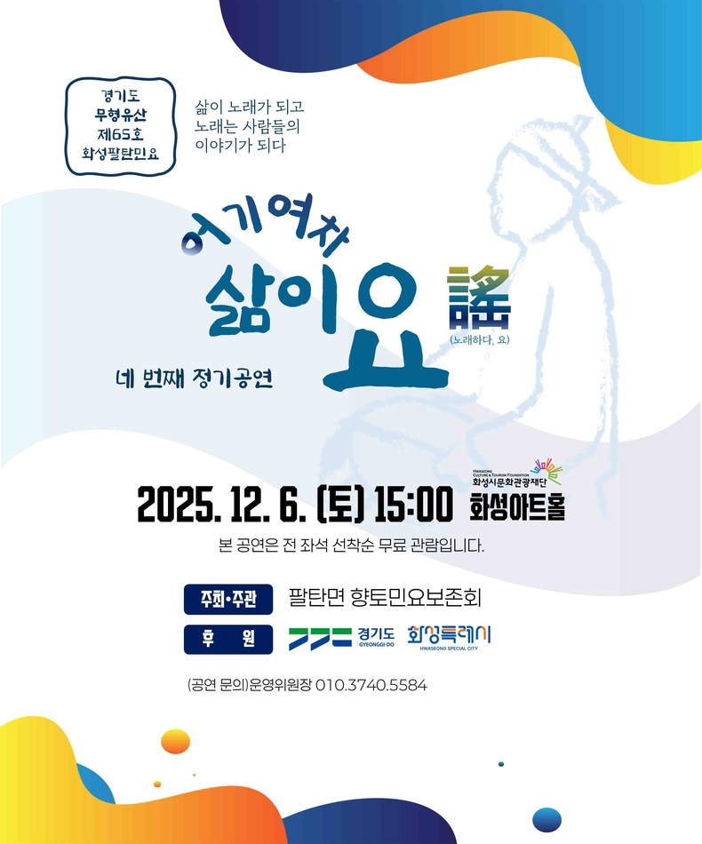 박준영 팔탄면향토민요보존회장은 “화성팔탄민요가 지닌 소박하지만 뜨거운 삶의 이야기들을 시민들과 함께 나누는 자리가 되길 바란다”면서 “앞으로도 우리 지역 고유의 민요가 세대와 세대를 이어가는 소중한 문화유산으로 자리매김할 수 있도록 최선을 다하겠다”고 밝혔다.
