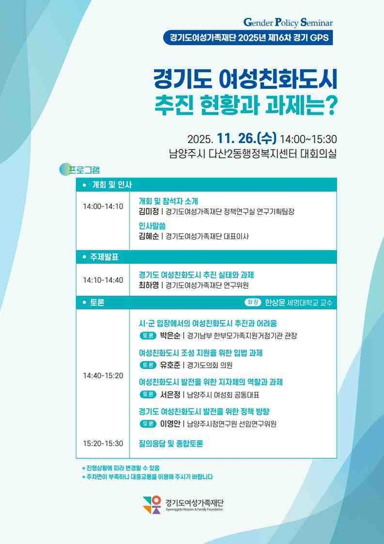 오는 26일 오후 2시 남양주시 다산2동 행정복지센터에서 열리는 토론회는 재단이 수행 중인 ‘경기도 시군 여성친화도시 추진 실태와 과제’ 연구를 주제로 도내 여성친화도시 현황을 점검하고 발전 방안을 모색하기 위해 마련됐다.
