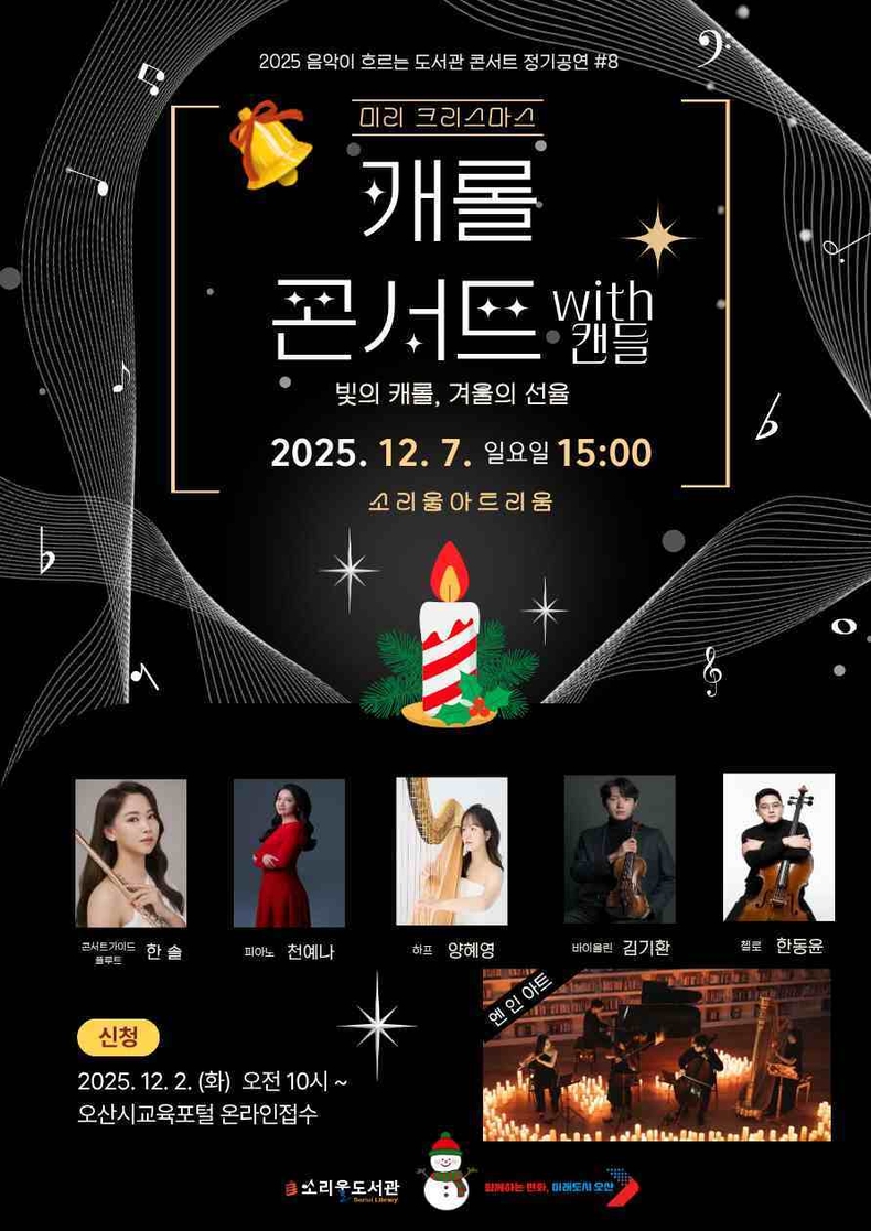 경기뉴스광장 정일수 기자 |오산시 소리울도서관은 연말을 맞아 시민들에게 겨울 감성을 선사하는 ‘미리 크리스마스–캐롤 콘서트 with 캔들’을 오는 12월7일 오후 3시 소리울아트리움에서 개최한다고 28일 밝혔다.