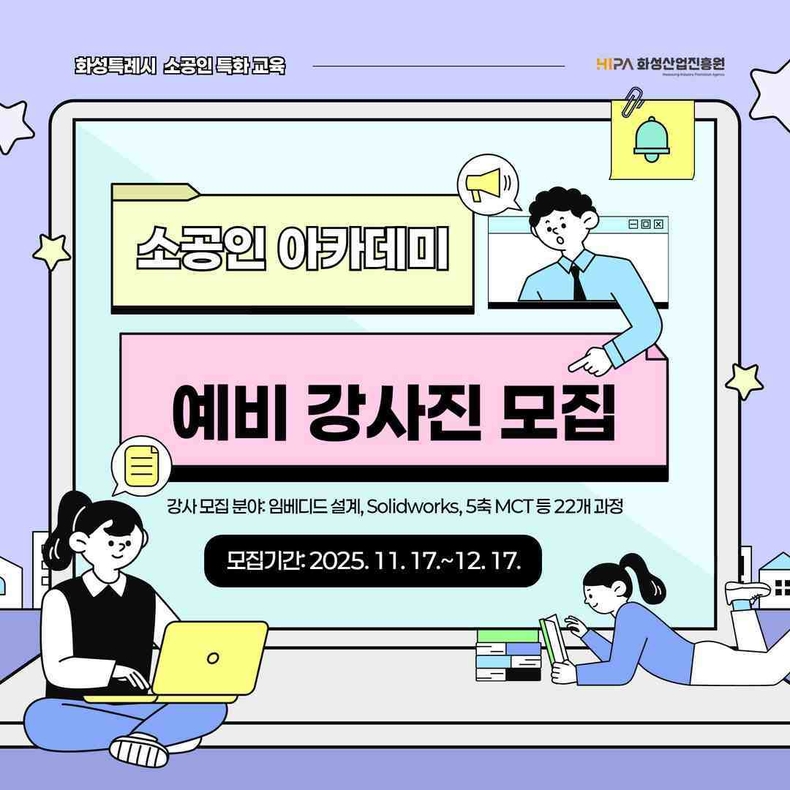 경기뉴스광장 정일수 기자 |화성산업진흥원이 앞으로 소공인 아카데미 프로그램을 운영할 예비 강사진을 오는 17일까지 모집한다고 2일 밝혔다.
