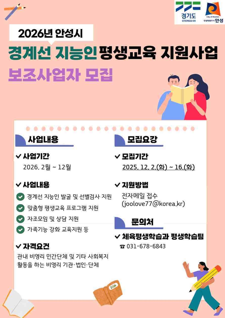 경기뉴스광장 정일수 기자 |안성시가 관내 경계선 지능인의 진단·학습·가족 지원을 체계화하고 포용적 학습환경을 조성하기 위해 2일부터 16일까지‘2026년 경계선 지능인 평생교육 지원사업’을 수행할 보조사업자를 공모한다.