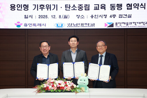 경기뉴스광장 정일수 기자 |용인시가 8일 시청 접견실에서 강남대학교, 용인예술과학대학교와 ‘용인형 기후위기·탄소중립 교육 동행 협약’을 체결했다.