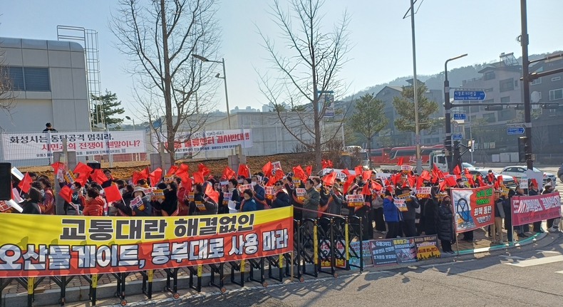 경기뉴스광장 정일수 기자 |16일 오후 화성시청 정문에서 “교통대란 해결 없이 오산톨게이트, 동부대로 사용마라”며 화성시 동탄 유통3부지 개발을 취소를 주장한 오산시민, 화성 동탄 일부 주민들이 시위를 벌이고 있다. [사진=정일수 기자]