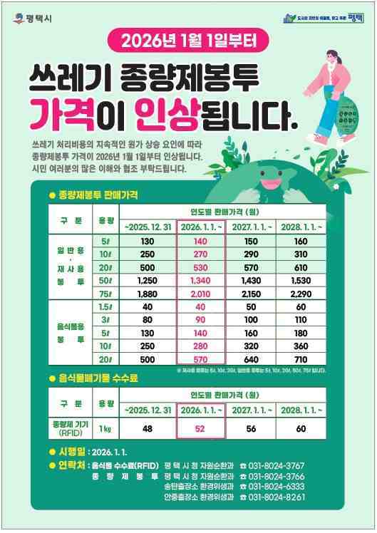 경기뉴스광장 정일수 기자 |평택시가 2026년 1월1일부터 쓰레기 종량제 봉투 가격을 3개년도에 걸쳐 인상한다.