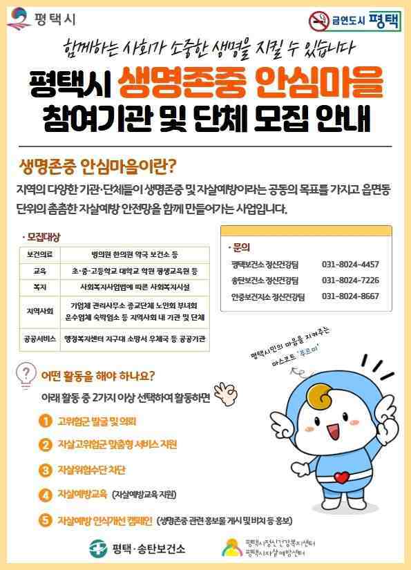 평택시 평택·송탄보건소는 자살 고위험군을 미리 발굴하고 맞춤형 지원을 제공하는 ‘생명존중 안심마을’ 사업을 지속적으로 확대 운영함과 동시에, 사업에 함께 참여할 지역 내 공공기관과 민간기관을 모집한다.