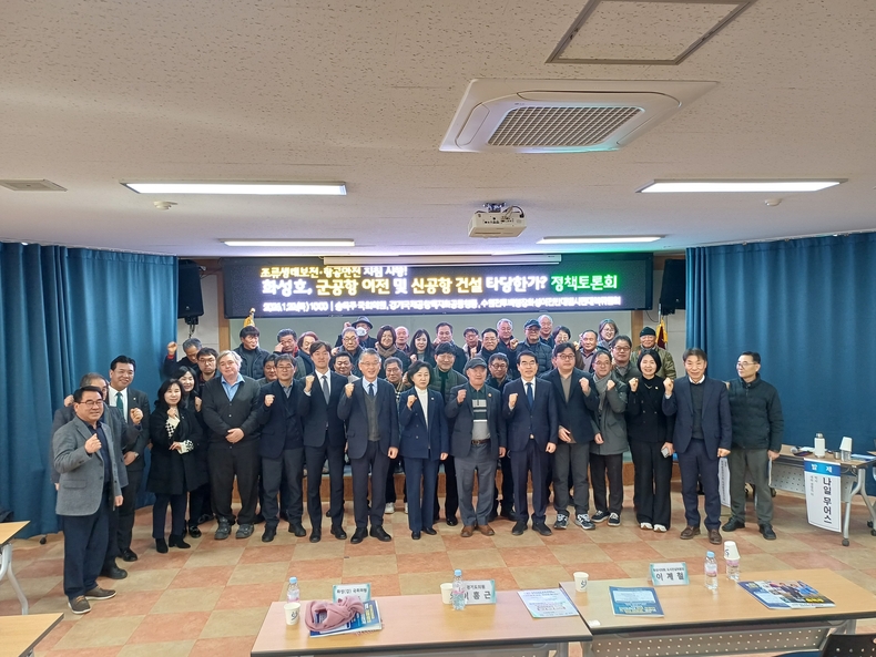 경기뉴스광장 정일수 기자 |수원전투비행장 화성이전반대 범시민대책위원회가 송옥주 국회의원, 경기국제공항백지화공동행동과 29일 오전 10시부터 11시 45분까지 화성시 향남읍 행정복지센터 대회의실에서 ‘화성호, 군공항 이전 및 신공항 건설 타당한가?’를 정책토론회를 개최했다.