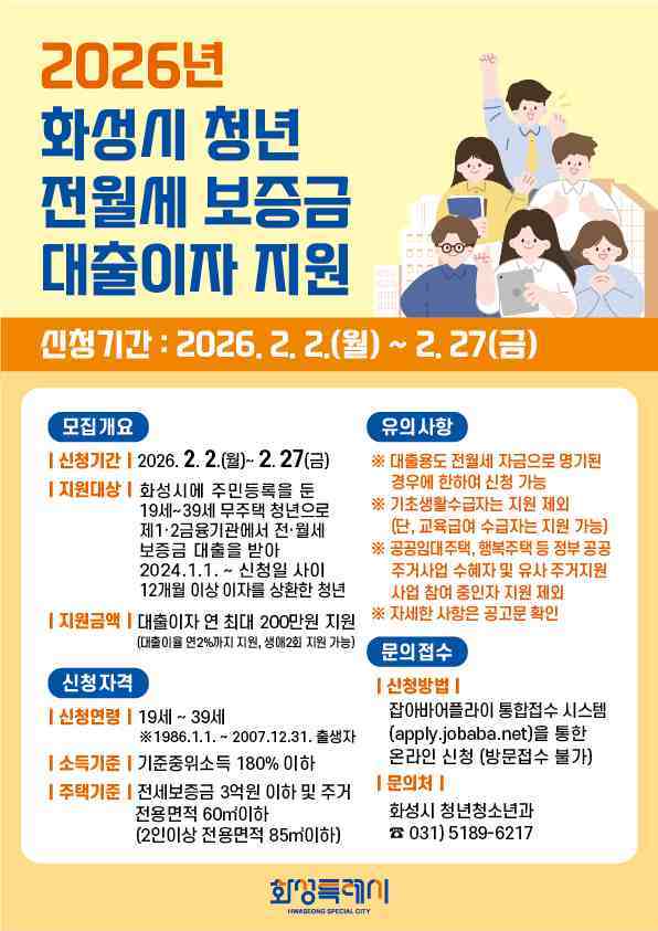 경기뉴스광장 정일수 기자 |화성특례시가 2일부터 오는 27일까지 청년들의 주거비 부담 경감 및 정주 여건 향상을 위해 ‘청년 전·월세 보증금 대출이자 지원사업’ 신청을 받는다.