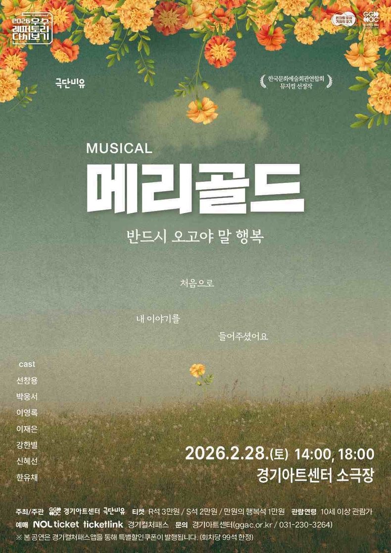 같은 날 뮤지컬 ‘메리골드’ 공연 2만5000원권 할인쿠폰을 지급하는 특별 관람 프로모션도 시작돼 경기 컬처패스 앱을 사용할 경우 R석을 5천 원에 관람할 수 있다.