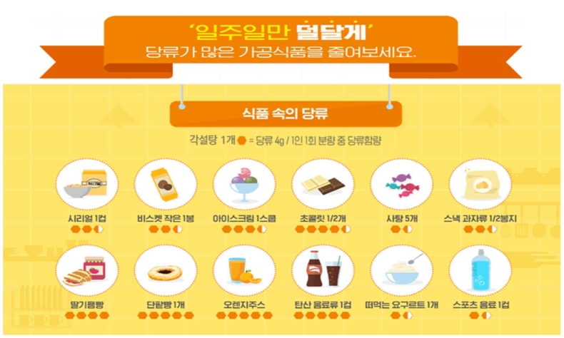 주요 실천 수칙은 △가공식품 영양표시 확인하기(간식을 고를 때 당류 함량을 반드시 확인하는 습관 갖기) △음료수 대신 물 마시기(탄산음료나 가당 음료 대신 물 섭취 권장하기) △간식 횟수 줄이기(사탕이나 초콜릿 같은 단순당 섭취 횟수를 단계적으로 줄이기) 등이다.