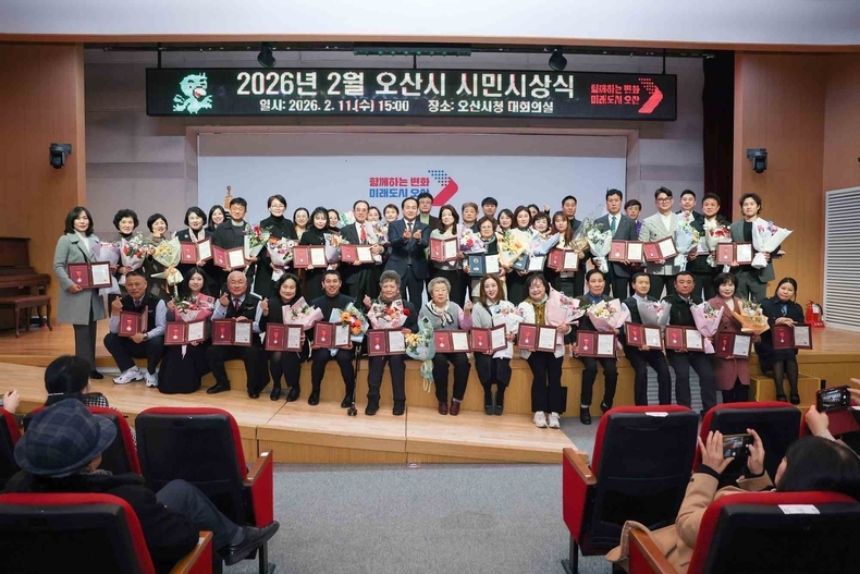 경기뉴스광장 정일수 기자 |오산시가 지난 11일 오산시청 대회의실에서 ‘2026년 2월 시민시상식’을 개최하고, 지역사회 발전과 이웃사랑 실천에 기여한 시민 46명을 대상으로 표창을 수여했다.