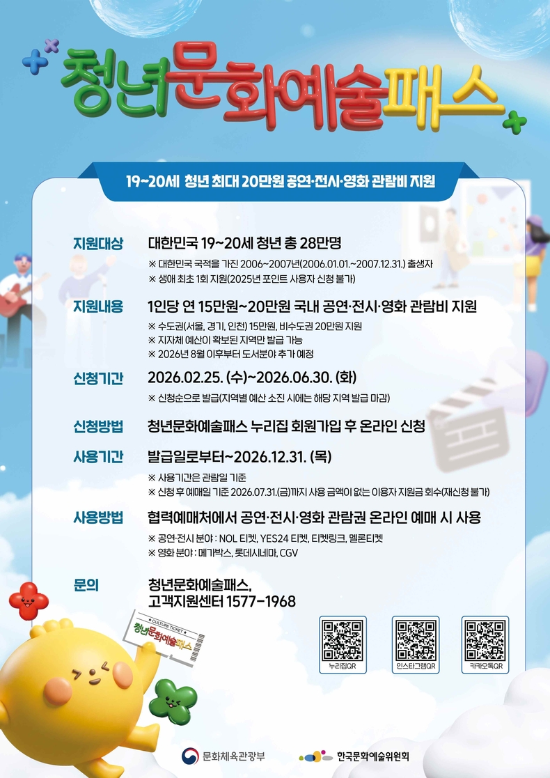 신청은 2월25일부터 6월30일까지로 청년문화예술패스 누리집에서 가능하며, 발급된 포인트는 올해 말까지 사용할 수 있다. 다만, 7월31일까지 사용 이력이 없는 경우 지원금이 회수되며 재신청이 불가하다. 상세 내용은 공식 누리집에서 확인할 수 있다.