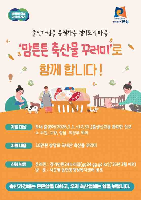 이에 따라 경기도에 주소를 두고 2026년 1월1일~12월31일까지 안성시에 자녀 출생신고를 마친 산모에게 1인당 10만원 상당의 국내산 축산물 꾸러미를 지원한다.