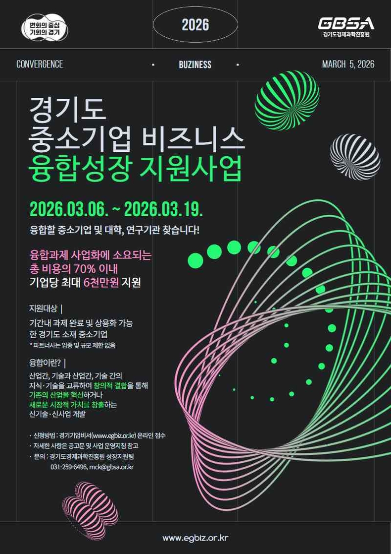 경기뉴스광장 강성규 기자 |경기도와 (재)경기도경제과학진흥원(이하 경과원)이 도내 중소기업의 혁신 성장과 새로운 비즈니스 모델 발굴을 돕는 ‘2026년 중소기업 비즈니스 융합성장 지원사업’의 참여기업을 모집한다.