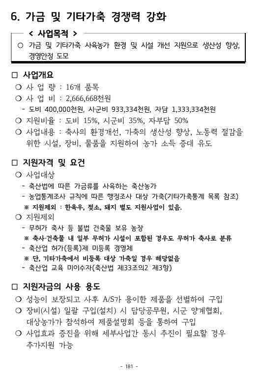 ‘가금 및 기타가축 사육농가 지원사업’은 시설 현대화를 통한 축사 환경 개선, 방역 물품 지원 등을 통한 생산성 향상이 주요 내용이다.