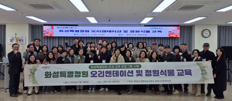 시는 지난 3월7일 동탄구청 대회의실에서 화성특별정원단 15팀 40여 명과 특별자문위원, 관계 공무원이 참석한 가운데 ‘화성특별정원 조성을 위한 오리엔테이션 및 정원식물 교육’을 진행했다.