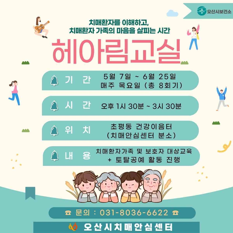 경기뉴스광장 정일수 기자 |오산시치매안심센터가 치매 환자와 가족의 정서적 부담을 완화하고 돌봄 역량 강화를 지원하기 위해 치매 가족 대상 프로그램 ‘헤아림 교실’ 2기 참여자를 모집한다고 14일 밝혔다.
