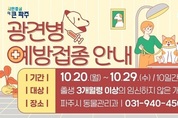 경기뉴스광장 강성규 기자 |파주시는 반려견을 동반한 야외활동이 잦아지는 가을을 맞아 오는 20일부터 29일까지 생후 3개월 이상의 임신하지 않은 개를 대상으로 광견병 예방접종을 실시한다고 10일 밝혔다. 광견병은 바이러스에 의해 사람과 동물 모두에게 감염될 수 있는 인수공통전염병으로, 잠복기가 상당히 길고 증세가 나타날 경우 치사율이 매우 높기 때문에 사람과 반려동물 모두를 위해 반려견은 매년 1회 반드시 예방접종할 것을 적극 권장하고 있다. 시는 하반기 광견병 예방사업을 위해 예방백신 4500마리 분을 무상 지원하며, 예방접종을 희망하는 반려견 보호자는 33개 지정 동물병원을 방문해 시술비 1만원만 부담하면 접종이 가능하다. 참여 동물병원 목록은 파주시청 누리집 공고문을 통해 확인할 수 있다. 동물병원이 없는 읍면지역은 시에서 직접 수의사를 파견해 순회접종을 진행하며, 이 경우 접종비 전액을 시에서 지원할 방침이다. 아울러 시는 야생동물의 광견병 전파를 막기 위해 광견병 미끼백신을 너구리 등 야생동물이 자주 출몰하는 관내 야산에 살포하는 사업도 지속 추진 중이다. 이광재 동물관리과장은 “광견병은 사람에게도 치명적인 질병인데다 특히 야외에서 기르는 반려견은