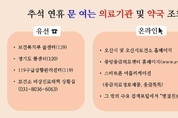 경기뉴스광장 정일수 기자 |오산시가 다가오는 추석 연휴 기간 시민들의 건강을 보호하고 의료 공백을 최소화하기 위해 오는 3일부터 9일까지‘비상진료체계’를 본격 가동한다고 1일 밝혔다. 연휴 기간 동안 오산한국병원과 조은오산병원 응급실은 24시간 운영되며, 응급환자 발생시 신속한 진료가 가능하다. 또 소아환자를 위한 달빛어린이병원(서울어린이병원, 웰봄병원)도 휴무 없이 오전 9시부터 오후 6시까지 진료를 이어가 아동 보호에 공백이 발생하지 않도록 할 예정이다. 시는 일반 진료 수요에 대비해 충분한 수의 병·의원과 약국을 ‘문 여는 의료기관 및 약국’으로 지정해 운영한다. 오산시보건소는 연휴 기간 내내 비상진료대책 상황실을 설치·운영하며, 지정 의료기관 및 약국 운영 현황을 점검하고 응급환자 진료가 원활히 이뤄지도록 지도·감독을 강화할 계획이다. 시 관계자는 “연휴 중 의료기관 이용 불편을 최소화할 수 있도록 다각적인 대비를 했다”며 시민들의 적극적인 활용을 당부했다. 추석 연휴 기간 이용 가능한 의료기관과 약국 정보는 △오산시 및 보건소 홈페이지 △중앙응급의료센터 홈페이지(www.e-gen.or.kr) △스마트폰 앱(응급의료정보제공, 응급똑똑) △보건복지부 콜