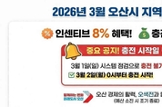 경기뉴스광장 정일수 기자 |오산시가 오는 3월 지역화폐 ‘오색전’ 인센티브를 충전 금액의 8%로 운영한다고 26일 밝혔다. 시민 1인당 충전 한도는 100만원으로, 최대 8만원까지 인센티브 혜택을 받을 수 있다. 이번 3월 인센티브는 예산 소진 시까지 선착순으로 충전 즉시 지급된다. 예산이 모두 소진될 경우 해당 월 인센티브 지급은 조기에 종료될 수 있다. 오색전은 관내 전통시장과 음식점, 학원, 병원 등 다양한 가맹점에서 사용할 수 있으며, 가맹점 정보는 ‘경기지역화폐’ 앱과 오색전 홈페이지에서 확인 가능하다. 지역 내 소비를 촉진하고 소상공인 매출 증대에 기여하는 수단으로 활용되고 있다. 다만, 금융기관 전산시스템 점검 및 업그레이드 작업으로 인해 3월 1일 0시부터 23시 59분까지 하루 동안 오색전 충전 서비스가 일시 중단된다. 기존에 보유하고 있는 잔액은 점검 시간에도 정상적으로 결제할 수 있다. 이에 따라 인센티브가 적용되는 3월 충전은 3월2일 0시부터 가능하다. 시민들은 충전 일정에 유의해 이용해야 한다. 이권재 시장은 “금융기관 시스템 점검으로 인해 3월 1일 하루동안 충전 서비스가 제한되는 점에 대해 시민 여러분의 양해와 확인을 부탁드린다”
