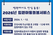 경기뉴스광장 정일수 기자 |안성시가 아동이 입원한 병원에 입원아동보호사를 파견하는 입원아동돌봄서비스를 2026년에도 계속 운영해 안정적인 돌봄 지원을 이어간다고 31일 밝혔다. 입원아동돌봄서비스는 아동의 장기 입원이나 갑작스러운 입원으로 돌봄 공백이 발생했을 때 아동이 입원한 병원으로 입원아동보호사를 파견해 식사 및 복약 지원 등의 돌봄서비스를 제공하는 사업이다. 2026년 운영되는 입원아동돌봄서비스는 전년도와 동일하게 아동이 입원한 병원의 위치와 관계없이 안성시에 주소지를 둔 아동(3개월~12세 이하)을 대상으로 지원하며, 이용요금은 시간당 최소 1400원에서 최대 7000원으로 소득 판정 유형에 따라 차등 지원한다. 서비스를 이용한 한 보호자는 “어린 둘째 아이 때문에 집을 비울 수 없어 난감했는데 입원아동돌봄서비스를 이용할 수 있어 큰 도움이 됐다”며서 “다자녀· 맞벌이 가정에 꼭 필요한 사업인 것 같다”고 밝혔다. 서비스 신청은 수행기관인 안성시 가족센터로 전화 신청을 통해 가능하며, 이용요금 산정을 위한 소득 판정은 읍면동 행정복지센터로 방문 신청하면 된다.