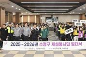 경기뉴스광장 정일수 기자 |성남시는 폭설에 대응하기 위해 수정, 중원, 분당 등 구별로 시민들이 참여하는 제설봉사단을 구성해 운영하고 있다고 18일 밝혔다. 이를 위해 수정구는 지난 12월16일 오후 2시 구청 1층 대회의실에서 수정경찰서와 합동 대책회의를 하고, 제설봉사단 발대식을 개최했다. 수정구는 경찰과의 합동 대책회의 자리에서 지난 12월4일 단시간에 집중된 폭설 당시의 현장 대응체계를 점검하고, 도로 교통혼잡과 안전사고 발생을 최소화하기 위한 기관 간 협력방안과 대응 매뉴얼을 논의했다. 이어진 수정구 제설봉사단 발대식엔 전체 단원 1122명 가운데 100명이 참석해 폭설로 인한 주민 불편을 최소화하고 적극적인 제설 자원봉사 활동에 참여할 것을 다짐했다. 제설봉사단은 강설시 이면도로 경사로, 보도, 육교 등 제설 취약 지역에 우선 투입된다. 전경만 수정구청장은 “제설봉사단은 제설 작업 이외에도 ‘내 집 앞, 눈 치우기’를 주변에 적극적으로 홍보해 주민들의 관심과 협조를 이끌어 내는 역할도 중요하다”면서 “민·관·경의 유기적인 협력을 통해 주민들이 안전하게 겨울을 날 수 있도록 노력해 나가겠다”고 밝혔다. 구별 제설봉사단 인원은 중원구 954명, 분당구