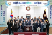 경기뉴스광장 정일수 기자 |화성특례시의회(의장 배정수)는 12일 제246회 제2차 정례회 본회의에서 ‘화성특례시의회 의원 정수 관련 제도 개선 촉구 건의안’을 원안 가결했다. 이번 안건은 배정수 의장의 대표 발의했으며, 25명의 전체 의원 모두가 필요성에 공감해 한마음으로 추진했다는 점에서, 지방의회 의원 정수산정 방식의 구조적 문제를 개선해야 한다는 의지를 담고 있다. 본회의 산회 후에는 의원들이 함께 건의안 낭독 퍼포먼스를 진행하며 제도 개선의 필요성과 취지를 시민들에게 공유했다. 화성특례시의회는 현재 의원 1인당 약 4만2000명의 시민을 대표하고 있어 전국 평균(약 1만7000명)과 경기도 평균(약 3만명)을 크게 웃도는 상황에 놓여 있다. 이는 특례시 중에서도 가장 높은 수준으로, 급격한 인구 증가에도 불구하고 의회 구성은 사실상 정체돼 있어 대표성과 감시 기능이 충분히 발휘되지 못하는 구조적 한계를 보여주고 있다. 화성특례시는 인구 100만을 넘어 특례시로 지정된 이후 도시 규모와 행정수요가 빠르게 확대되고 있다. 하지만, 의회 의원 정수는 일반 기초자치단체와 동일한 기준에 묶여 있어 의정활동 전반에 과부하가 발생하고 있다는 지적이 이어지고 있다.