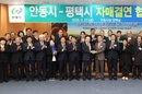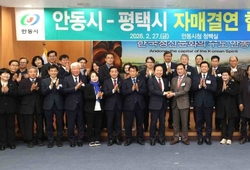 경기뉴스광장 정일수 기자 |평택시의회가 지난 2월27일 안동시청에서 평택시-안동시 자매결연 협약식에 참석해 양 도시의 상생 발전을 다짐했다. 이날 협약식에는 평택시의회 이종원 의회운영위원장, 김영주 기획행정위원장을 비롯하여 정장선 평택시장 등 평택시 대표단이 참석하고 김경도 안동시의회 의장, 권기창 안동시장 등 안동시 대표단이 함께하며 상호 협력 의지를 다졌다. 협약식은 △협약서 서명 및 교환 △기념품 교환 △지역 농특산품 판로 개척 및 로컬푸드 교류 협력 방안 등이 논의됐다. 이어 안동 하회마을을 방문해 문화·관광 교류 확대에 대해서도 의견을 나눴다. 평택시의회 이종원 의회운영위원장은 “평택은 서해안의 관문이자 국제교류의 중심 도시이고, 안동은 깊은 전통과 유교 문화가 뿌리내린 선비문화의 본고장”이라며 “서로 다른 강점과 매력을 지닌 두 도시가 손을 맞잡는 의미는 매우 크다”고 밝혔다. 김경도 안동시의회 의장은 “평택시와의 자매결연은 전통과 산업이 만나 새로운 상생 모델을 만들어가는 소중한 계기”라면서 “문화·관광은 물론 농업과 경제 분야까지 실질적인 협력으로 이어지길 기대한다”고 말했다.