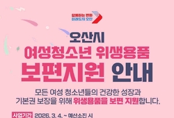 경기뉴스광장 정일수 기자 |오산시가 관내 11세부터 18세까지의 여성청소년을 대상으로 ‘여성청소년 위생용품 보편지원 사업’을 추진한다고 10일 밝혔다. 이번 사업은 여성청소년의 경제적 부담을 완화하고 건강한 성장 환경을 조성하기 위해 생리용품 구입비를 지원하는 사업이다. 다만, 여성가족부가 시행하는 기초생활수급자·차상위계층·한부모가족 대상 여성청소년 생리용품 바우처 지원사업과는 중복 지원이 불가하다. 지원 대상은 오산시에 거주하는 11세부터 18세까지의 여성청소년으로, 등록 외국인과 국내거소신고자 등 외국인 청소년도 포함된다. 지원 금액은 1인당 월 1만1800원, 연 최대 14만2000원이며, 오산시 경기지역화폐 모바일 ‘오색전’으로 지급된다. 지원금은 오산시 내 지역화폐 가맹 편의점인 CU, GS25, 세븐일레븐, 이마트24 등에서 사용할 수 있으며, 배달특급 앱을 통한 온라인 구매도 가능하다. 신청 기간은 예산 소진 시까지이며, 온라인 신청은 오는 31일 오후 6시까지 가능하다. 신청은 경기민원24 온라인 신청 또는 주소지 관할 행정복지센터 방문을 통해 할 수 있으며, 청소년 본인(15세 이상) 또는 보호자, 주양육자가 신청할 수 있다.