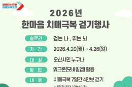 경기뉴스광장 정일수 기자 |안성시보건소 치매안심센터가 지난 11일 안성농업인직거래새벽시장에서 지역 주민과 치매 환자 가족 등 900여 명이 참여한 가운데 ‘2026 한마음 치매극복 걷기행사’를 성공적으로 개최했다고 13일 밝혔다. 이번 행사는 치매 예방에 효과적인 ‘걷기’를 실천하며 치매 극복에 대한 사회적 공감대를 형성하고, 치매 친화적인 환경을 조성하기 위해 마련됐다. 사전 및 현장 접수를 통해 참여한 시민들은 아양1공원을 중심으로 한 1코스와 금석천 산책로로 이어지는 2코스를 걸으며 건강 증진과 함께 지역의 봄 풍경을 만끽했다. 특히, 온라인 플랫폼 ‘워크온’을 활용한 걷기 챌린지를 병행해 비대면 참여 기회를 제공함으로써, 치매와 더불어 살아갈 수 있는 사회적 분위기를 확산하는 데 기여했다. 행사장에서는 걷기 외에도 주제별 체험 부스, 치매 예방 홍보, 포토존, 전통놀이 등 다채로운 프로그램이 운영되어 주민들에게 즐거움을 선사했다. 또한 치매극복선도단체인 노인복지관, 약사회, 안성맞춤시니어클럽을 비롯해 해병대전우회, 중앙어머니자율방범대, 의용소방대 등 지역 내 10여 개 기관·단체 소속 100여 명의 자원봉사자가 참여해 행사를 지원했다. 이밖에도 안성성