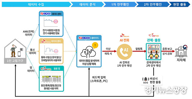 해당 서비스는 지역 내 65세 이상 고독사 위험 가구의 통신데이터, 전력 사용량 등의 생활 데이터를 통합적으로 분석하고, 예측한 데이터에 미달할 경우 1차 AI 전화 안부 확인, 2차 관제센터 확인(전화·현장 출동) 방식으로 운영한다.