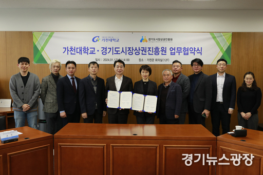 경기뉴스광장 최옥분 기자 |경기도시장상권진흥원(이하 경상원)은 지난 17일 가천대학교와 관·학 협력체계 구축을 통한 경기도 민생경제의 지속 성장 환경 구축 및 지역 경제 활성화 목적으로 가천대에서 업무협약을 체결했다고 19일 밝혔다.