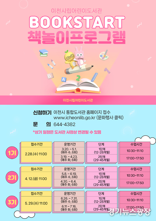 이번 상반기 북스타트 책놀이는 3월부터 7월까지 6회차씩 3기를 운영한다. 책놀이 프로그램은 1단계 12~28개월 유아와 보호자, 2단계 29~45개월 유아와 보호자가 함께 참여할 수 있다. 3월19일부터 시작하는 상반기 북스타트 책놀이 1기의 참여자는 2월28일 수요일 오전 11시부터 이천시통합도서관 홈페이지에서 선착순으로 모집한다.