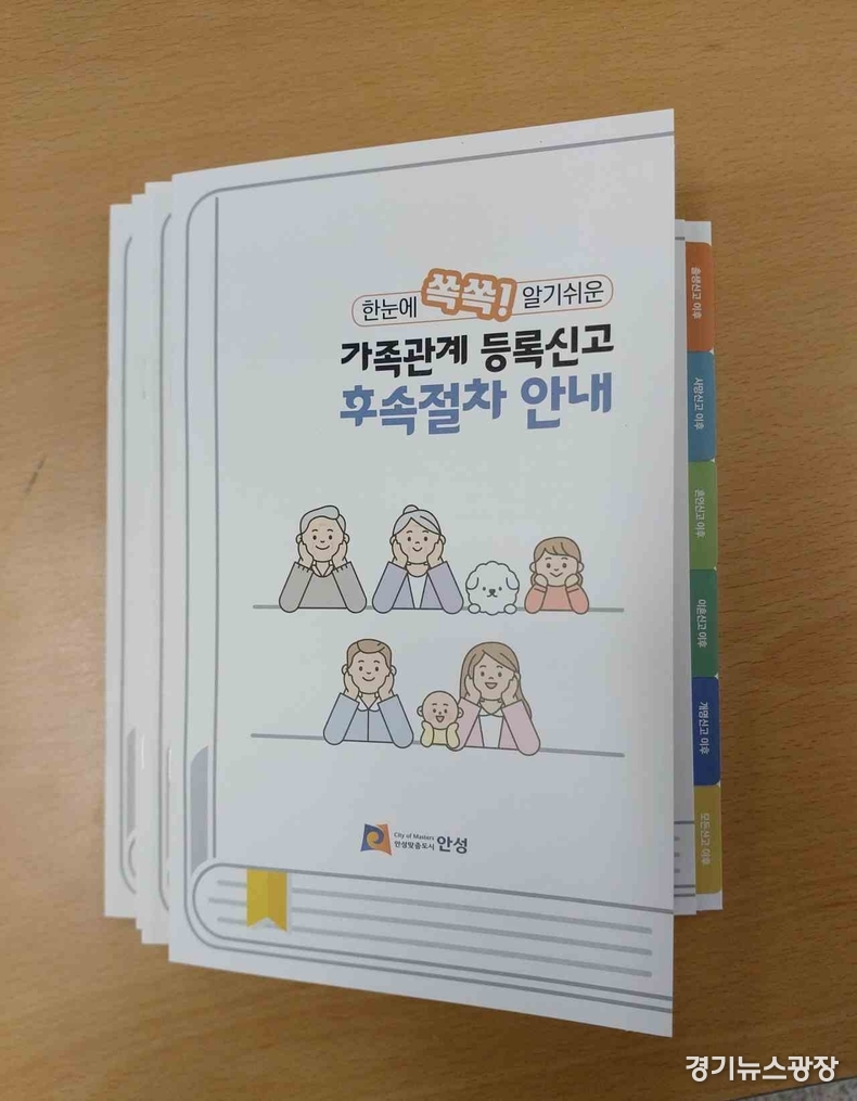 경기뉴스광장 최옥분 기자 |안성시는 시민들과 밀접한 출생·사망 등 가족관계등록신고 후속 조치사항과 각종 복지혜택을 수록한‘한눈에 쏙쏙 알기쉬운’안내 리플릿을 제작해 배포했다고 13일 밝혔다.