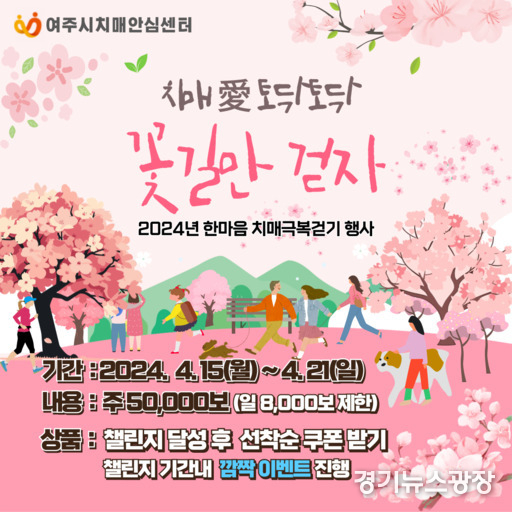 경기뉴스광장 최옥분 기자 |여주시 치매안심센터는 2024년 한마음 치매극복걷기 행사 치매 愛 토닥토닥 ‘꽃길만 걷자’를 4월15일부터 21일까지 7일 동안 온라인으로 진행한다.